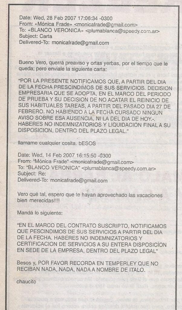 Unos días antes también se había comunicado con Blanco para enviarle la redacción  de otra CD de despido. En este caso a una personas contratada a quien se le pagaría “Haberes no indemnizatorios”.