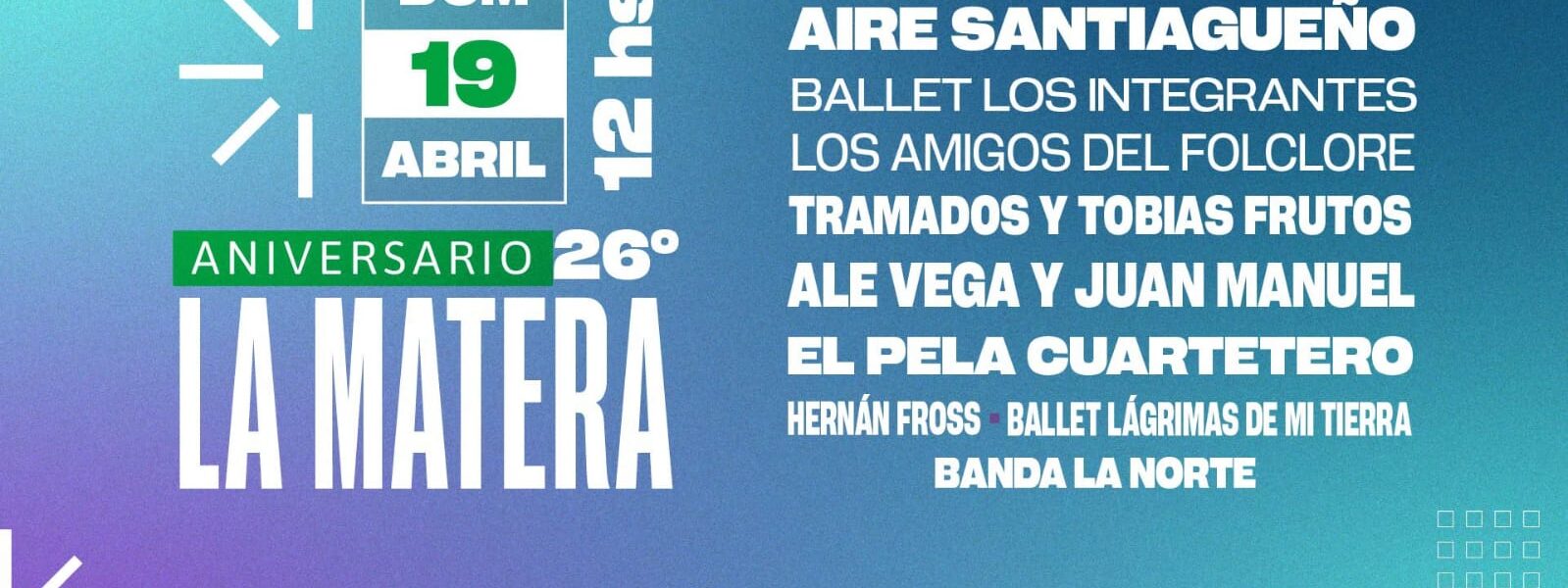 El Municipio de Quilmes invita a los vecinos y vecinas a participar de los festejos por el 26º aniversario del barrio La Matera, en la zona oeste de distrito, a realizarse este domingo 19 de abril, desde las 12, en la plaza de las calles 889 y 818, con stands de diferentes entidades y emprendedores barriales y una nueva edición del Festival “Somos Quilmes” con el cierre musical de Aire Santiagueño.