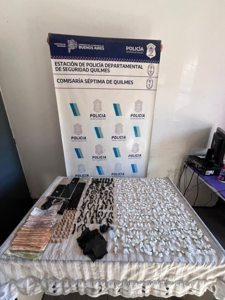 La Policía de Quilmes desmanteló una organización dedicada al narcomenudeo que operaba en una vivienda en Bernal Oeste. El operativo, que consistió en dos allanamientos simultáneos, culminó con la detención de siete personas y el secuestro de una pistola de guerra, municiones y dosis de estupefacientes fraccionadas para la venta.